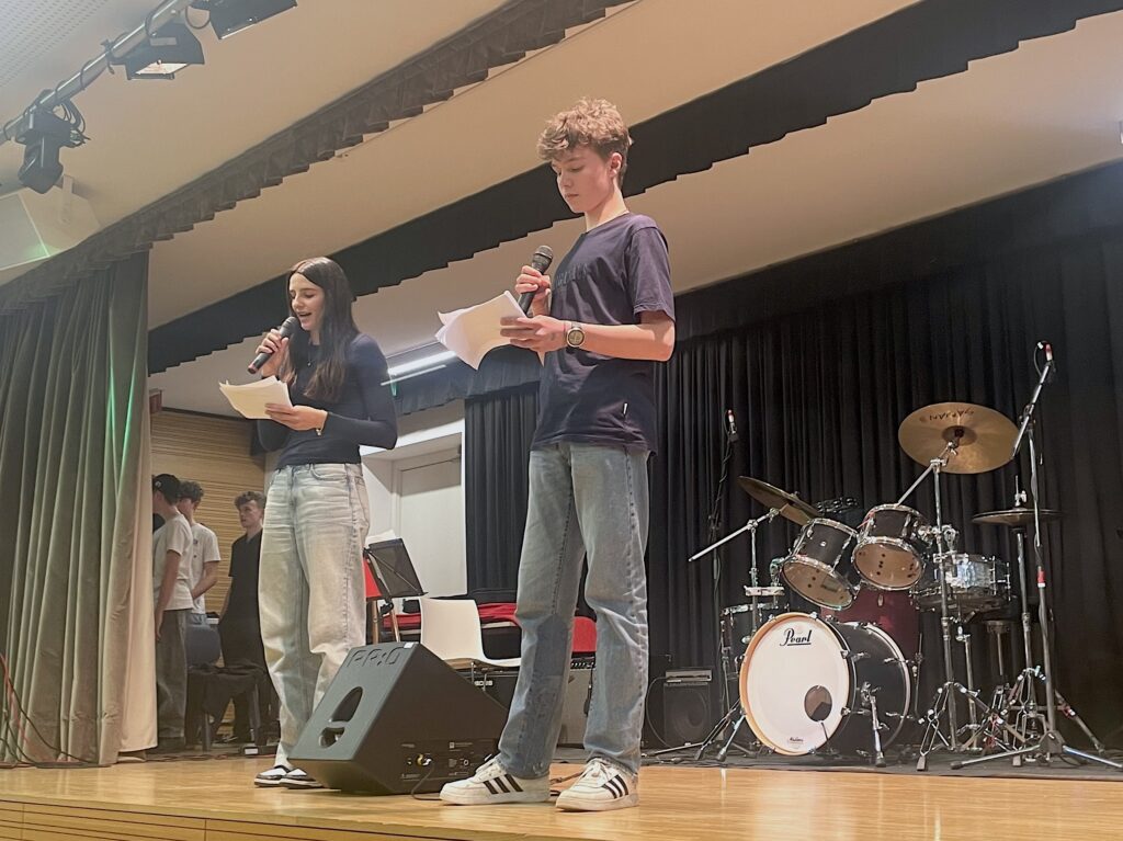 Am Elternabend in der Schulaula führten die Erstklässler Milena Davanzo und David Bauer durch das Programm, begleitet von der Schulband. Gemeinsam mit Eltern und Lehrpersonen blickten die Jugendlichen auf drei Wochen zurück, in denen sie Alltägliches neu organisieren mussten und mehr über ihr Medienverhalten lernten, als sie erwartet hatten.