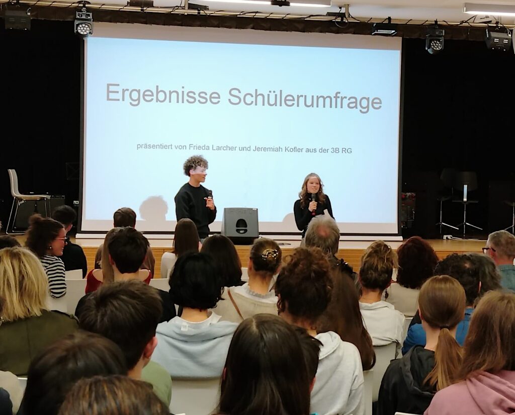 Doch was passiert, wenn man Jugendlichen das zentrale Werkzeug ihres Alltags entzieht? Frieda Larcher und Jeremiah Kofler aus der Klasse 3B/RG präsentierten den Eltern die Ergebnisse der internen Schülerbefragung – pointiert, theatralisch, aber exakt. Die ersten Tage seien „brutal“ gewesen, so die beiden Jugendlichen, nicht wegen Entzugserscheinungen, sondern wegen praktischer Fragen: Wie weckt man sich ohne Handy? Wie erfährt man die Buszeiten? Wie organisiert man Hausaufgaben ohne WhatsApp oder ChatGPT?