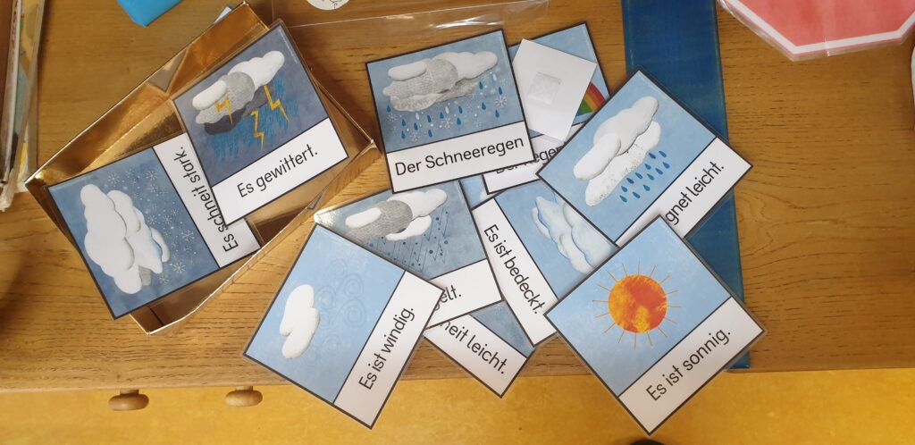 Zunächst wird gemeinsam der Wochenkalender betrachtet. Welcher Tag ist heute? Wie ist das Wetter draußen? Die Kinder schauen aus dem Fenster, beschreiben, was sie sehen, ergänzen das Wetterbild. Dann wird gezählt: Wer ist da, wer fehlt?