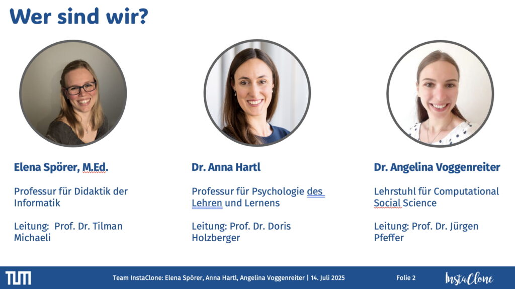 Jugendliche bedienen Instagram meist intuitiv. Doch wie Daten gesammelt, Algorithmen gesteuert und Inhalte ausgespielt werden, bleibt oft unsichtbar. Mit InstaClone haben Elena Spörer, Anna Hartl und Angelina Voggenreiter von der TU München gemeinsam mit Professorinnen und Professoren sowie Studierenden eine Lernplattform entwickelt, die diese Prozesse im Unterricht sichtbar machen soll.