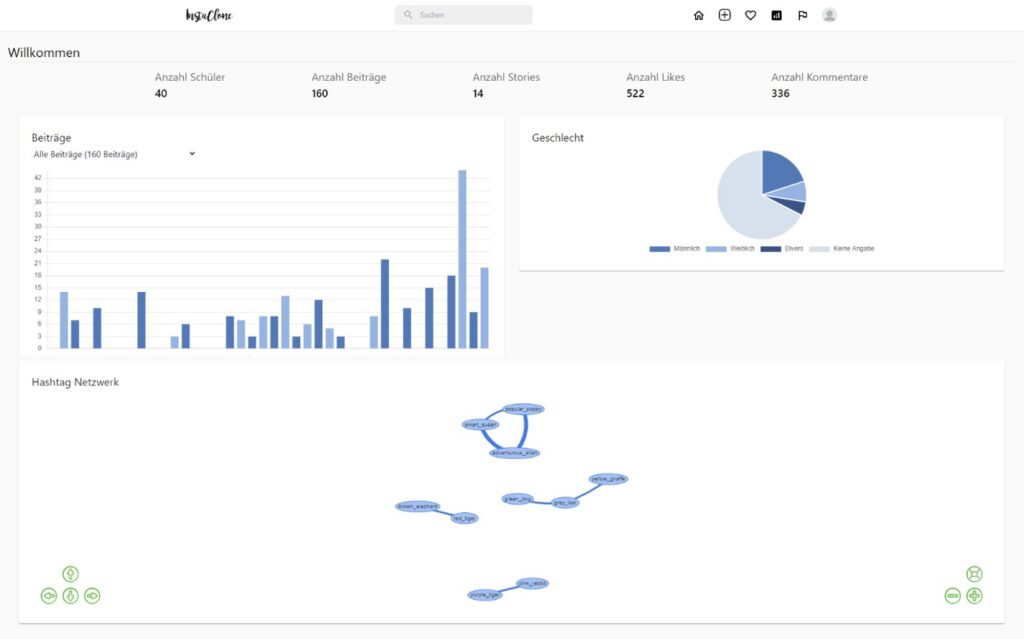 Elena Spörer: Der zweite große Unterschied ist, dass wir viele Funktionen eingebaut haben, um zu verstehen, wie Daten verarbeitet werden. Es gibt zum Beispiel ein Dashboard. Dort können die Schülerinnen und Schüler sehen, welche Daten sie erzeugt haben – etwa über Hashtags –, wie diese zusammenhängen, welche Altersangaben oder Interessen vorkommen und wie solche Informationen ausgewertet werden können. Im nächsten Schritt gibt es Funktionen, um zu verstehen, was man mit diesen Daten machen kann. Die Schülerinnen und Schüler können zum Beispiel selbst personalisierte Werbung erstellen oder den Newsfeed-Algorithmus verändern, sodass unterschiedlichen Schülerinnen und Schülern unterschiedliche Inhalte angezeigt werden. Sie schlüpfen also nicht nur in die Rolle der Nutzerinnen und Nutzer, sondern auch in die Rolle der Plattformen oder der Firmen, die mit Plattformen kooperieren. Zusätzlich haben wir Aufgaben, Arbeitshefte und Lehrmaterialien entwickelt, um Themen wie kritische Reflexion, Datennutzung und den Umgang mit anderen auf Social Media zu behandeln.