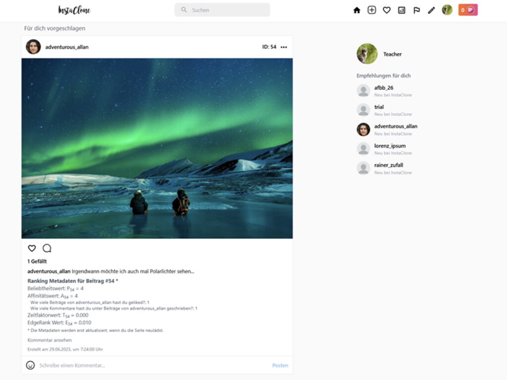 Posten, liken, kommentieren: Für viele Jugendliche gehört Social Media zum Alltag. Wie Plattformen funktionieren, welche Daten sie sammeln und warum Inhalte im Feed auftauchen, bleibt jedoch oft unsichtbar – auch für Erwachsene. Genau hier setzt InstaClone an. Das an der Technischen Universität München entwickelte Tool bildet Instagram in einer geschützten Unterrichtsumgebung nach. Schülerinnen und Schüler können posten, liken und kommentieren und zugleich nachvollziehen, wie Daten entstehen, Feeds sortiert oder Werbung ausgespielt wird. InstaClone wurde an der Technischen Universität München von Forschenden aus Informatikdidaktik (Elena Spörer, Professor Michaeli), Schul- und Unterrichtsforschung (Anna Hartl, Professor Holzberger), sowie Computational Social Science (Angelina Voggenreiter, Professor Pfeffer) gemeinsam mit Studierenden entwickelt. Das Ziel: Jugendliche sollen Social Media nicht nur nutzen, sondern auch verstehen.