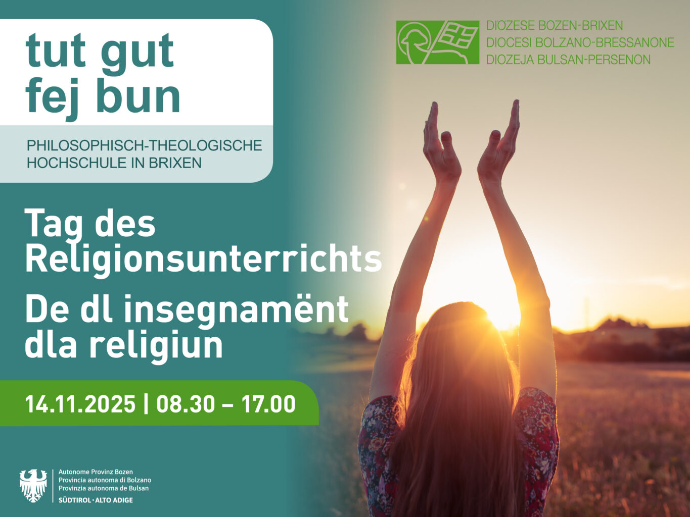 Am 14. November 2025 laden die Diözese Bozen-Brixen und die Deutsche Bildungsdirektion zum Tag des Religionsunterrichts nach Brixen an der Philosophisch-Theologischen Hochschule. Auf dem Programm steht ein bunter Mix: Tobias Zimmermann, Jesuit, Pädagoge und Schulentwickler, hält einen Online-Vortrag, danach geht’s in die Podiumsdiskussion zur Realität an Südtirols Schulen. Dazu gibt es inspirierende Impulsbeiträge und Workshops, die von spirituellen Kraftliedern über kreative Glasgestaltung bis hin zu sozialem Engagement alles abdecken.