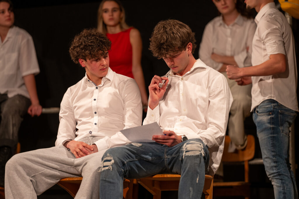 Moritz: Angefangen hat das schon am Ende des letzten Schuljahres. Unser Regisseur Gerd Weigel hat uns fünf Stücke vorgeschlagen, die wir über den Sommer gelesen haben. Wir wollten ursprünglich eigentlich kein gesellschaftskritisches Stück, sondern eher eine Komödie – etwas, das einfach unterhält. Am Ende konnten wir uns aber auf keines dieser Stücke einigen. Nach dem Sommer haben wir selbst weitergesucht und sind relativ schnell auf „Die Welle“ gestoßen. Die Mehrheit der Klasse war sofort begeistert. Dann haben wir im neuen Schuljahr ziemlich schnell mit den Proben begonnen.